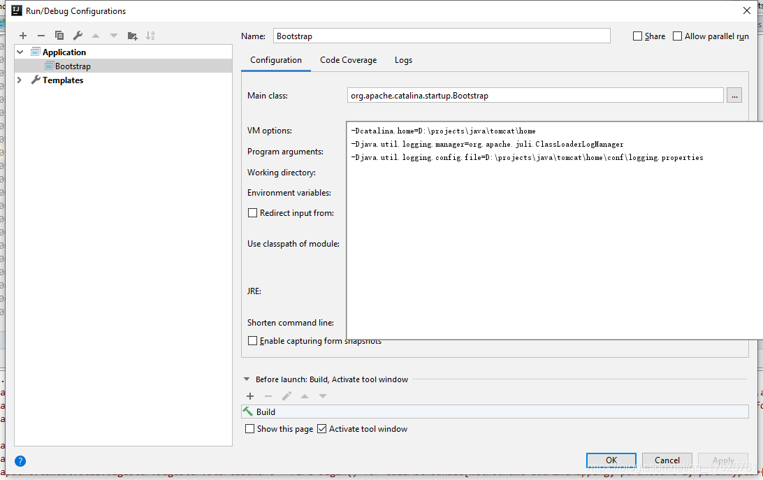 启动配置 Application, 设置Main和虚拟机参数catalina.home和日志管理类, 日志配置文件, home目录自己创建.