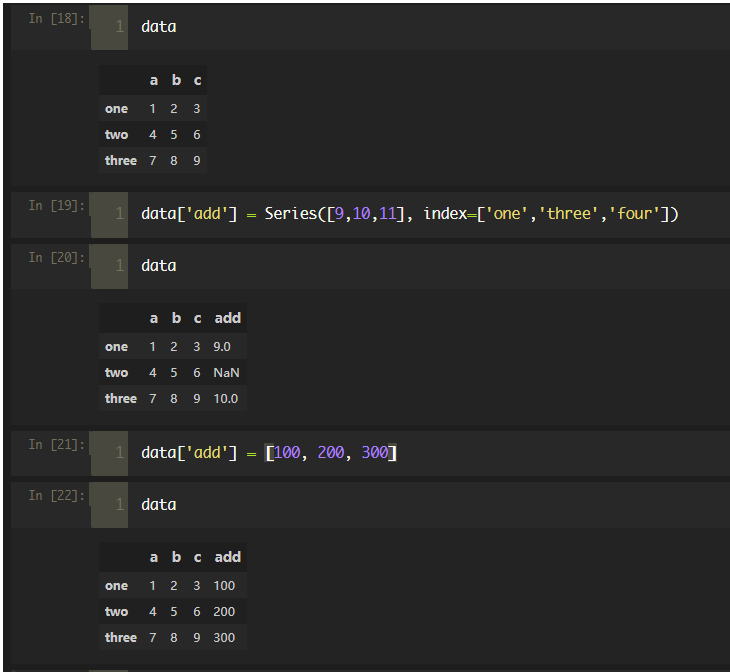 - 将Series赋值给DataFrame的列,二者的索引会精确匹配(索引不会合并,依旧是DataFrame的索引)