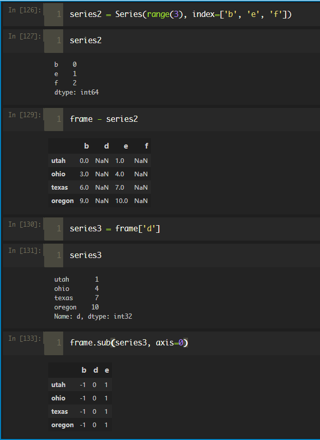 - DataFrame与Series之间的算术运算(+、-、*、/)