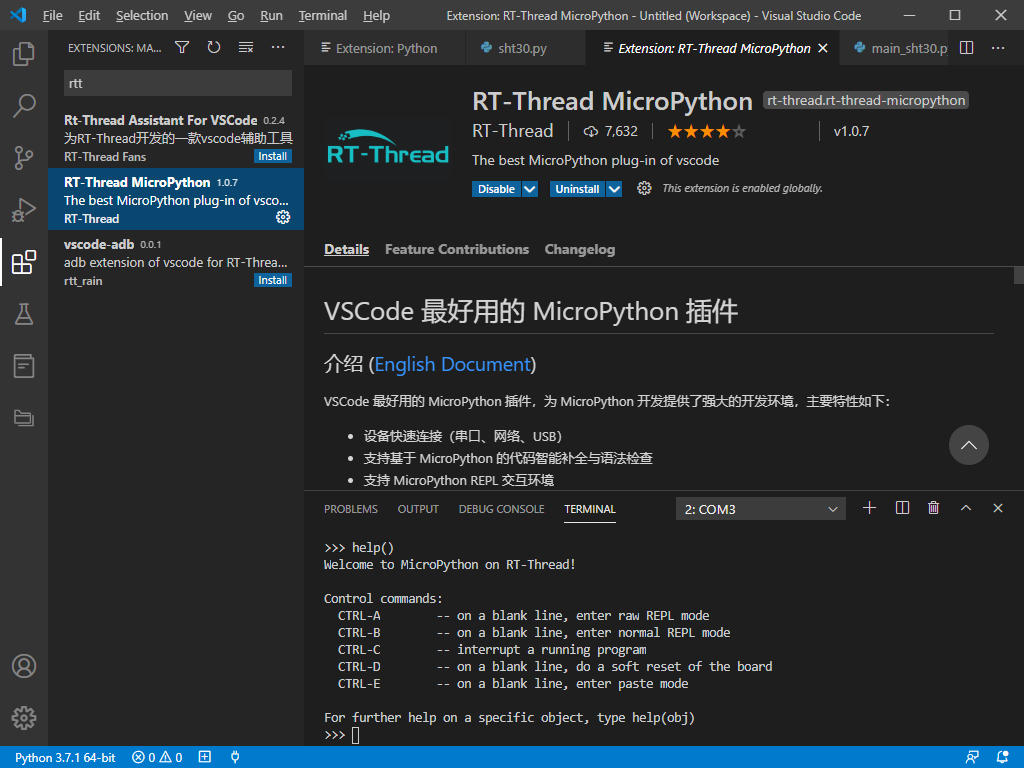 2.在vscode上用RT-Thread MicroPython连开发板,在TERMINAL的提示符>>>后输入help()