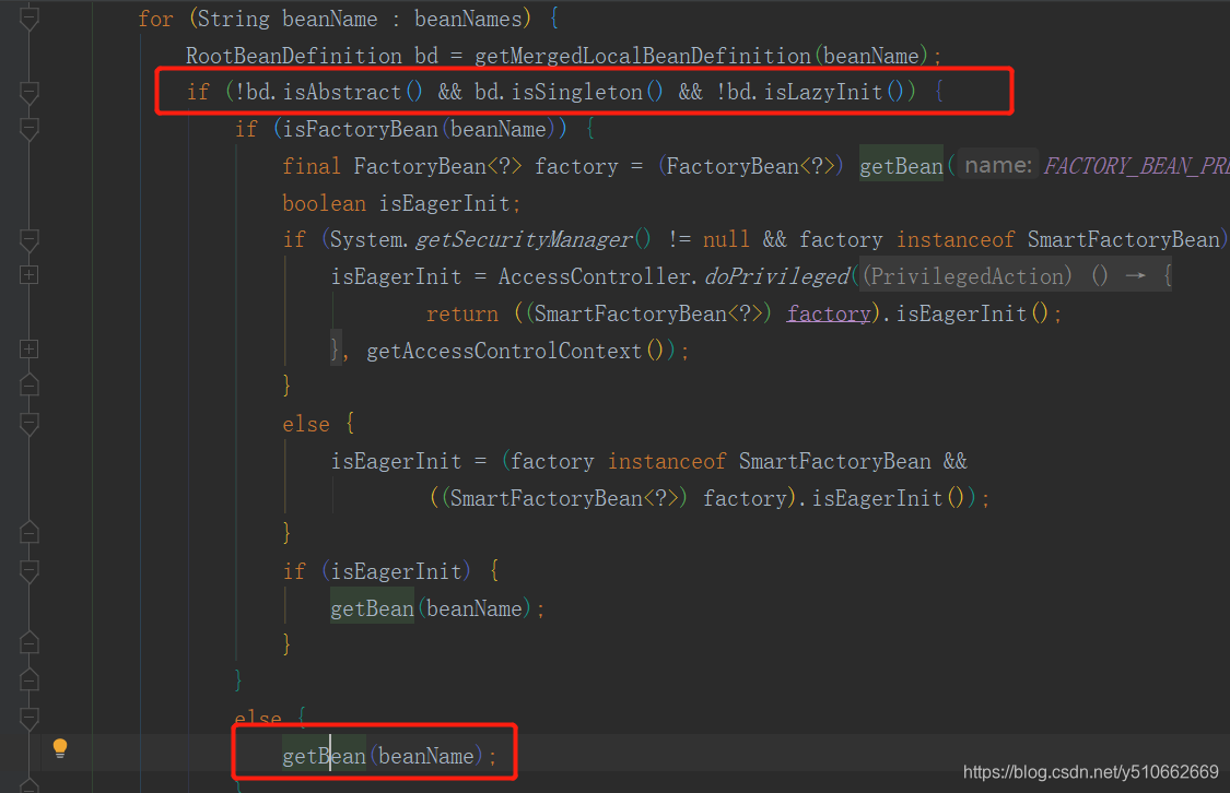 }其中会执行beanFactory.preInstantiateSingletons(), 此方法会初始化所有的单例的lazy-init=false的bean,即调用上面截图的方法。就会调用getBean方法,getBean方法是非常核心的一个方法,其中流程比较复杂。下面剖析下getbean的执行流程。