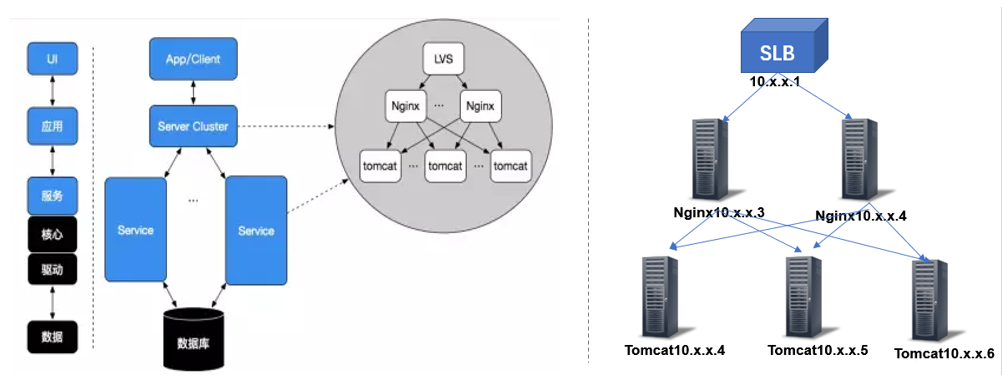 技术架构:确定组成应用系统的实际运行组件(lvs,nginx,tomcat,php-fpm等),这些运行组件之间的关系,以及部署到硬件的策略。