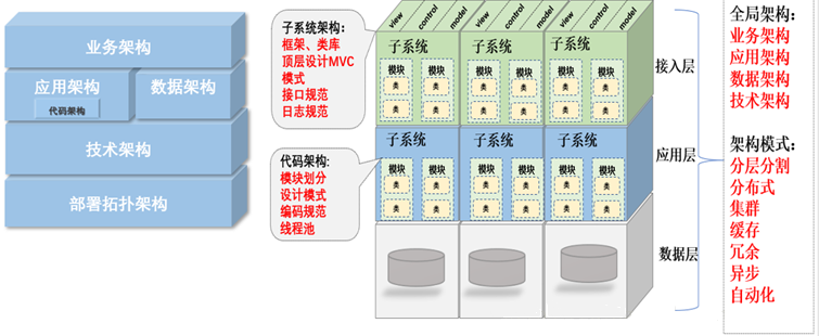 架构是经过系统性地思考, 权衡利弊之后在现有资源约束下的最合理决策, 最终明确的系统骨架: 包括子系统, 模块, 组件. 以及他们之间协作关系, 约束规范, 指导原则.并由它来指导团队中的每个人思想层面上的一致。涉及四方面: