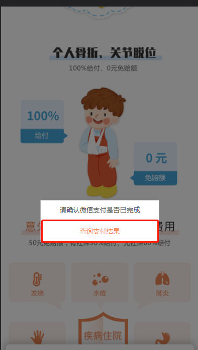 二、支付成功/失败后,在微信跳转会的页面增加弹层,让用户去触发查询保单是否生成的按钮,跳转相应支付成功/失败页面