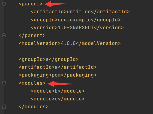 在a的pom中我们可以看到继承于untitle(parent),子模块有b和c(modules)