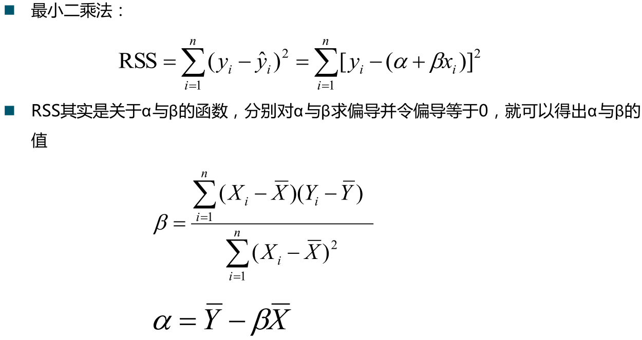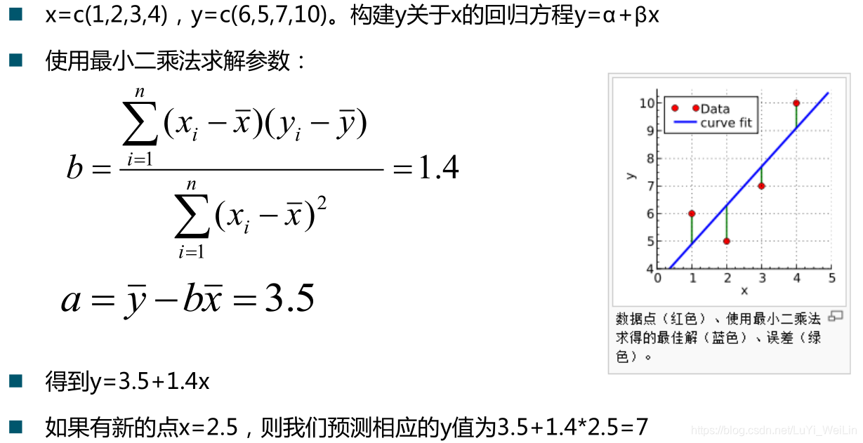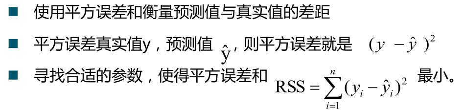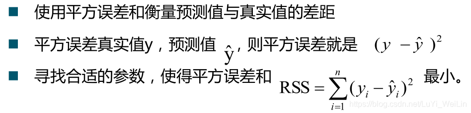 在这里会想到,如何确定方程中的系数呢?我们先来了解最小二乘法,简单来说就是这个点作y轴的平行线与直线相交,那一段y值的平方求和起来最小就是了
