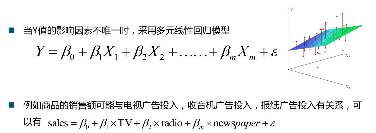 也就是一元线性回归是一个因素的,多元的话有多个因素建模,当考虑的因素为2个的话,还可以用三维坐标查看,因素多的话就不太好画出来了