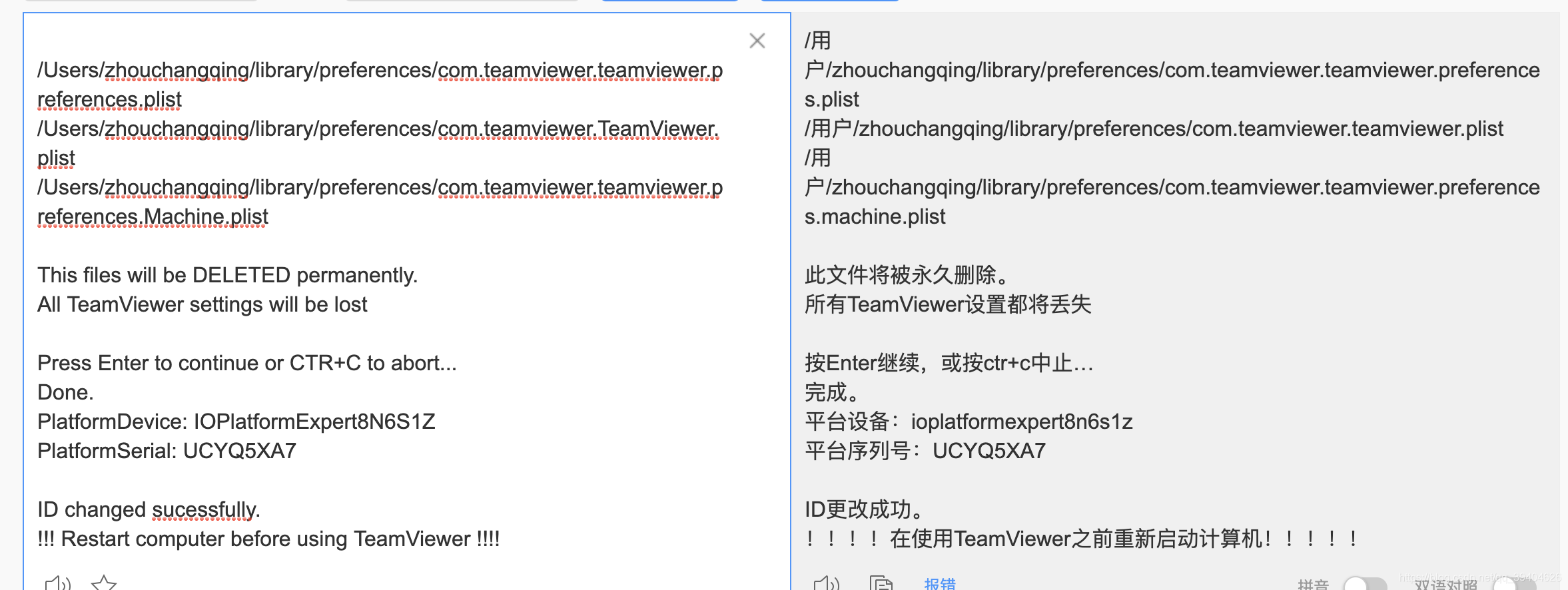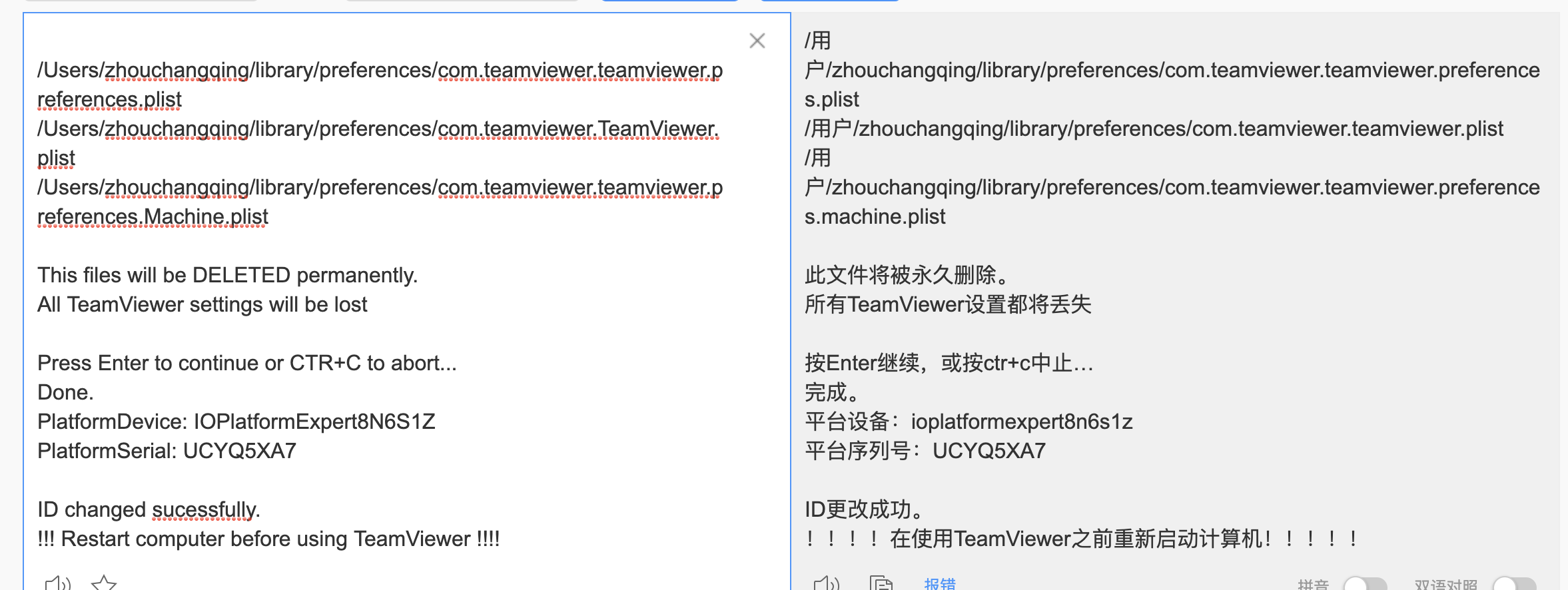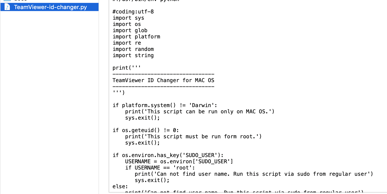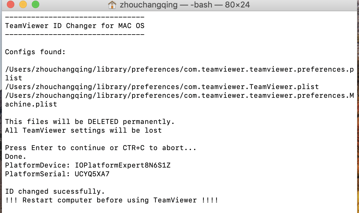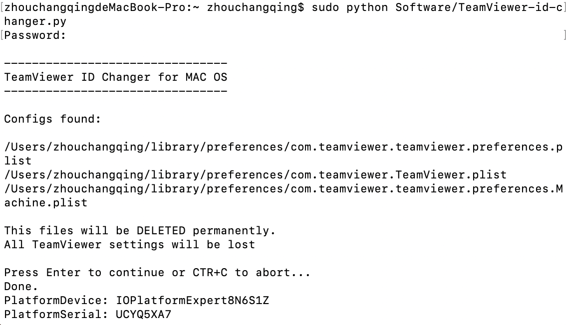 3.在终端运行此命令:sudo python Software/TeamViewer-id-changer.py (Software是本人放置文件的目录),Password就是你自己电脑开机密码。