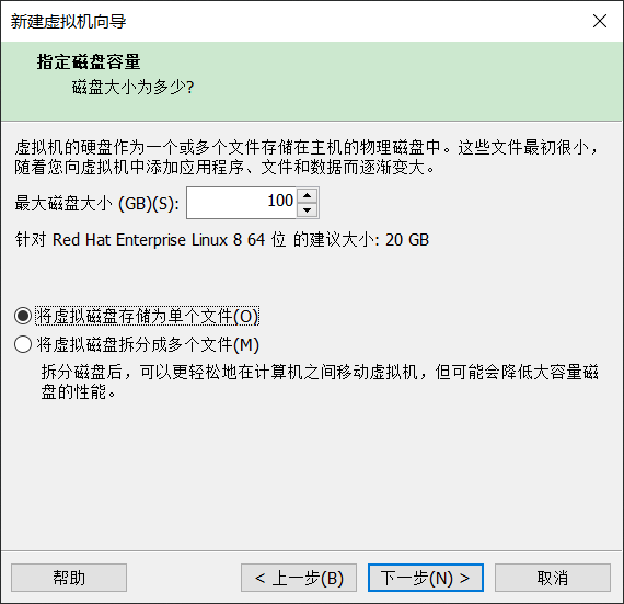 指定虚拟硬盘空间,如果本地硬盘空间充足,尽量设置磁盘空间大一些,后续Linux增加磁盘容量会很麻烦。