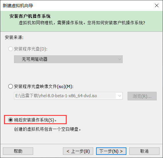 注:由于是最新版的rhel 8.0 所以VM14 已经不能支持最新版本的ISO镜像,需要升级VM版本至15。博主在VMware Workstation 14上尝试安装,安装程序光盘映像文件选项无法识别rhel-8.0的ISO镜像,使用稍后安装操作系统 选项安装,在安装过程中rhel-8.0镜像无法识别VMware Workstation 14的硬盘,导致后续无法安装。