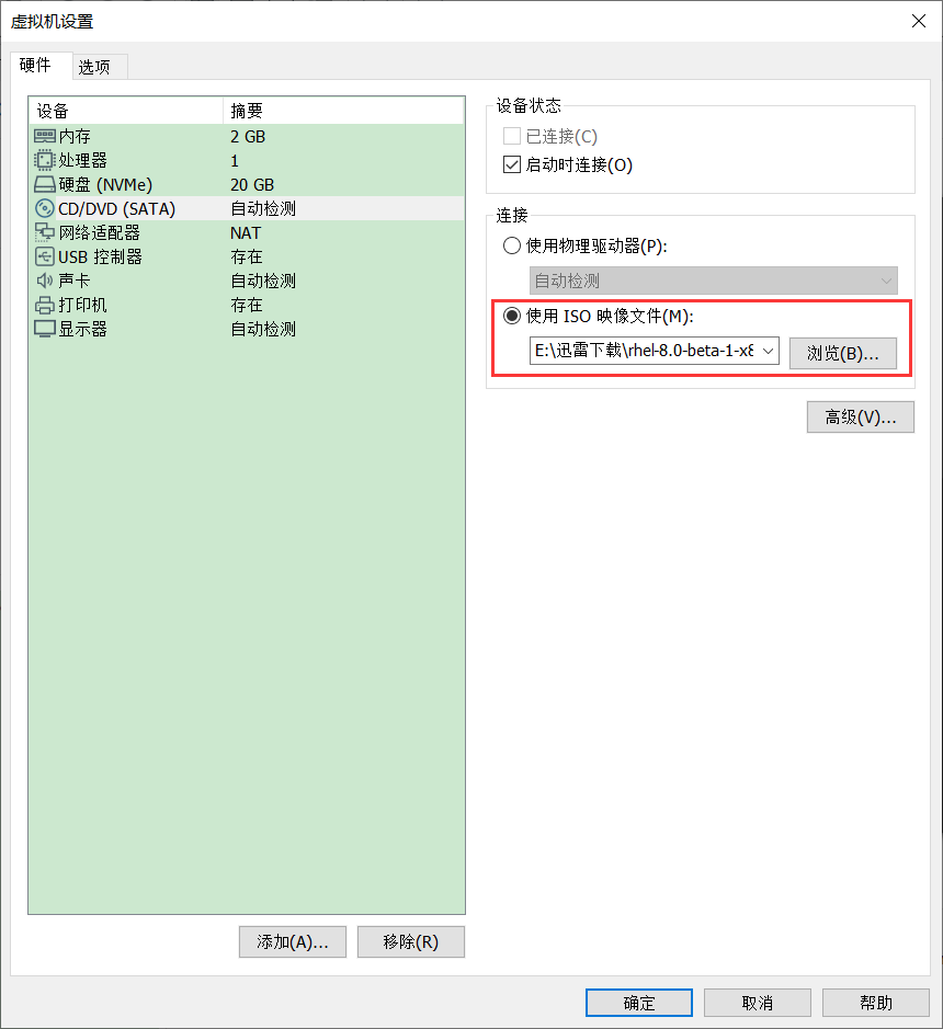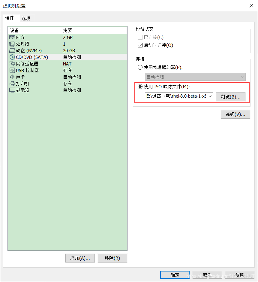 选择【使用ISO映像文件(M)】,浏览已经下载好的rhel-8.0-beta-1-x86_64-dvd.iso即可。