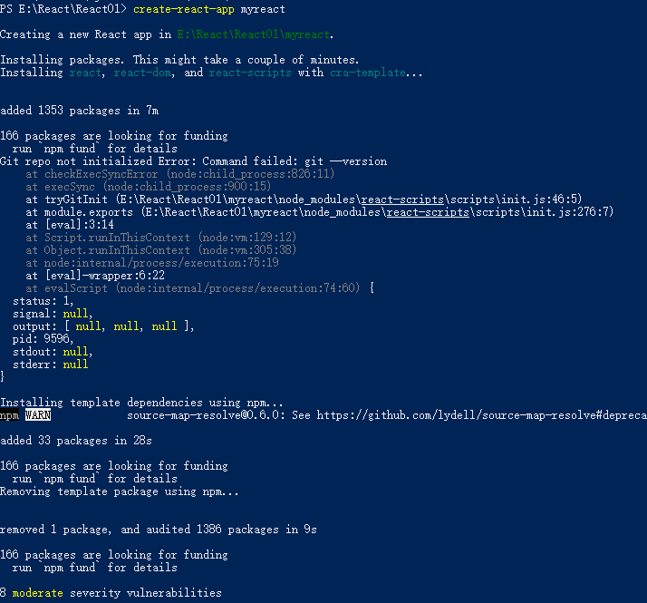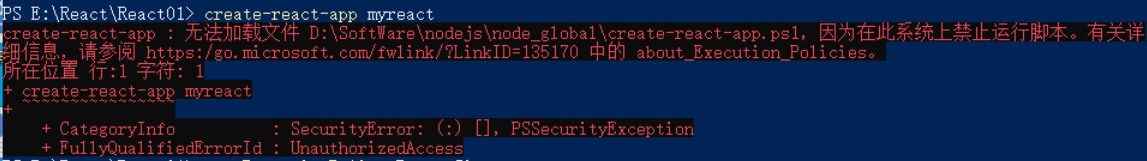 在Windows Powershell中使用create-react-app命令创建一个react项目时,报错。提示信息为: