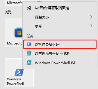 在开始菜单栏中找到 Windows Powershell,右击鼠标,选择“以管理员身份运行”