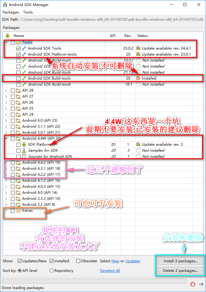 由于ADT Bundle包含了Eclipse、ADT插件和SDK Tools,是已经集成好的IDE,只需安装好Jdk即可开始开发,推荐初学者下载ADT Bundle,不用再折腾开发环境,