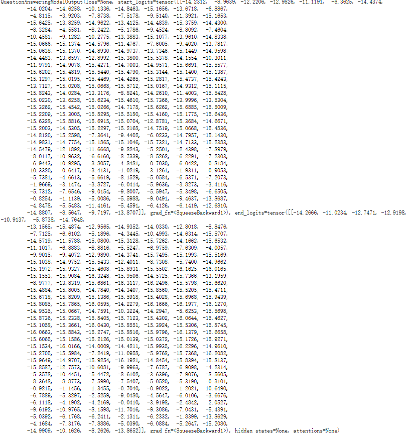 outputs = model(input_ids, attention_mask)输出是一个包含 答案起始位置 和 答案终止位置 的词向量