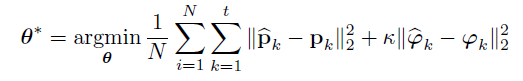 即真实位姿与估计位姿之间的欧式距离最小。损失函数由所有的位置p和方向φ的均方差(MSE)组成。(ϕ为欧式角)