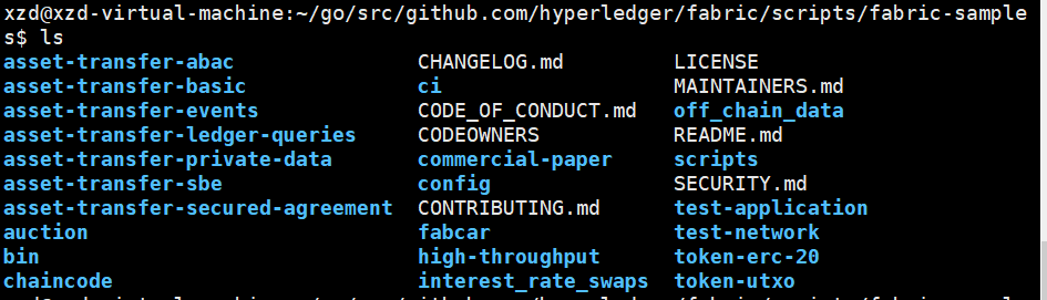 执行完以后就会出现fabric-samples的一个fabric的一些测试样例。
