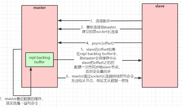 主节点会在内存中维护一个复制数据用的缓存队列,这个队列保存这最近一段时间的数据,master 和 slave 都会维护复制数据的下标 offset,和 master 的进程 id。因此当网络重连后,slave 会请求 master 继续未完成的复制,从所记录的下标位置开始,如果 master 的进程 id 变了,或者在 master 中的缓存队列中找不到这个下标,(意味着从节点的下标 offset 太旧了) 那么将会进行一次全量的数据复制。