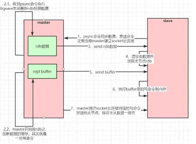 - master 接收到 PSYNC 命令后,会在后台通过 bgsave 命令,生成最新的 rdb 快照文件,在持久化期间,master 会继续接收客户端请求,把可能修改数据的请求记录在内存中,master 会把 rdb 文件发给 slave,salve 接收到 rdb 文件后,保存在本地,然后加载到内存中。 之后,master 会把刚刚记录在内存中的修改数据的命令再发给 slave, slave 再依次执行这些命令。达到数据一致。