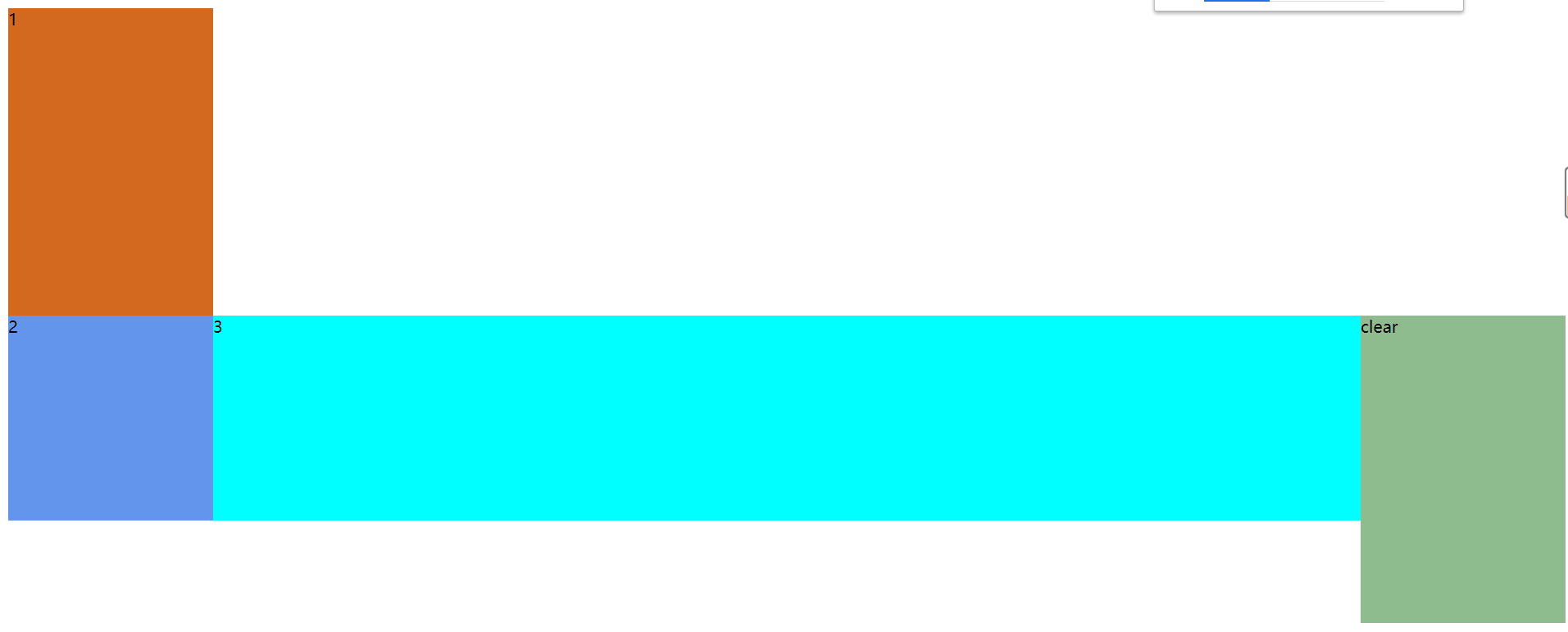 - 如果2没有设置向左浮动,则3会紧跟着2下面往下排列,而clear由于设置了向右浮动,和3的相对位置仍然如图,即会随着3一起往下移动一个2的高度,代码(html和之前是一样的,不再展示)和效果如下: