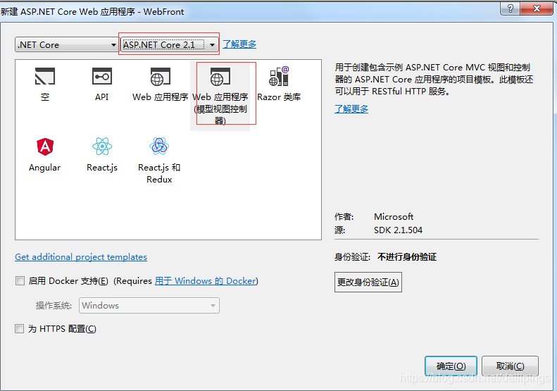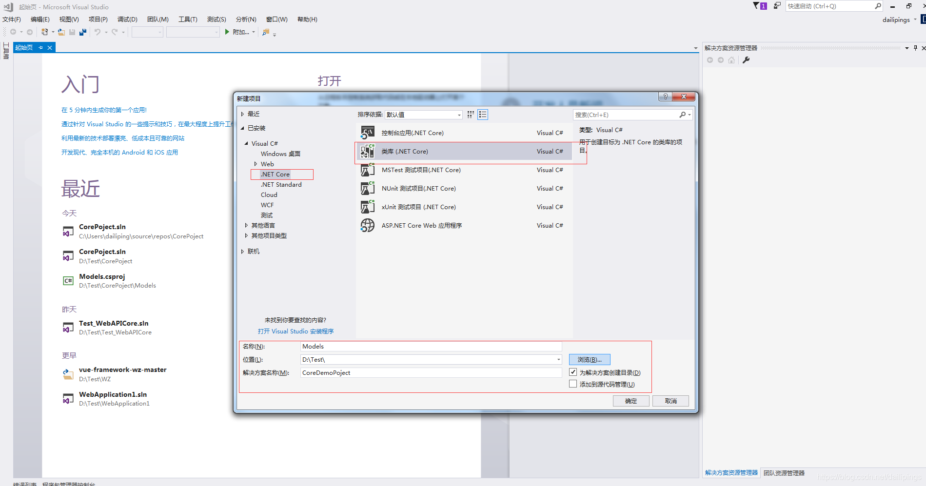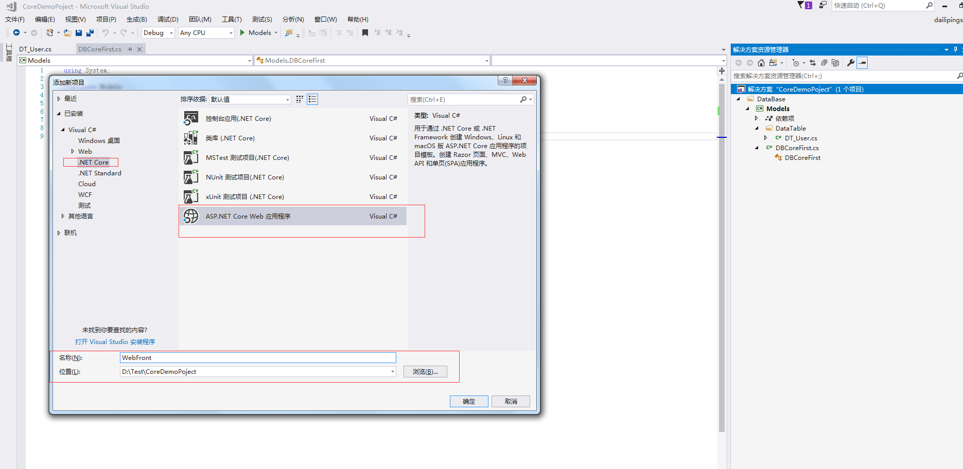 这里要注意ASP.NET Core的版本选择,后面NuGet包管理=>程序包管理控制台,添加依赖时的注意版本问题