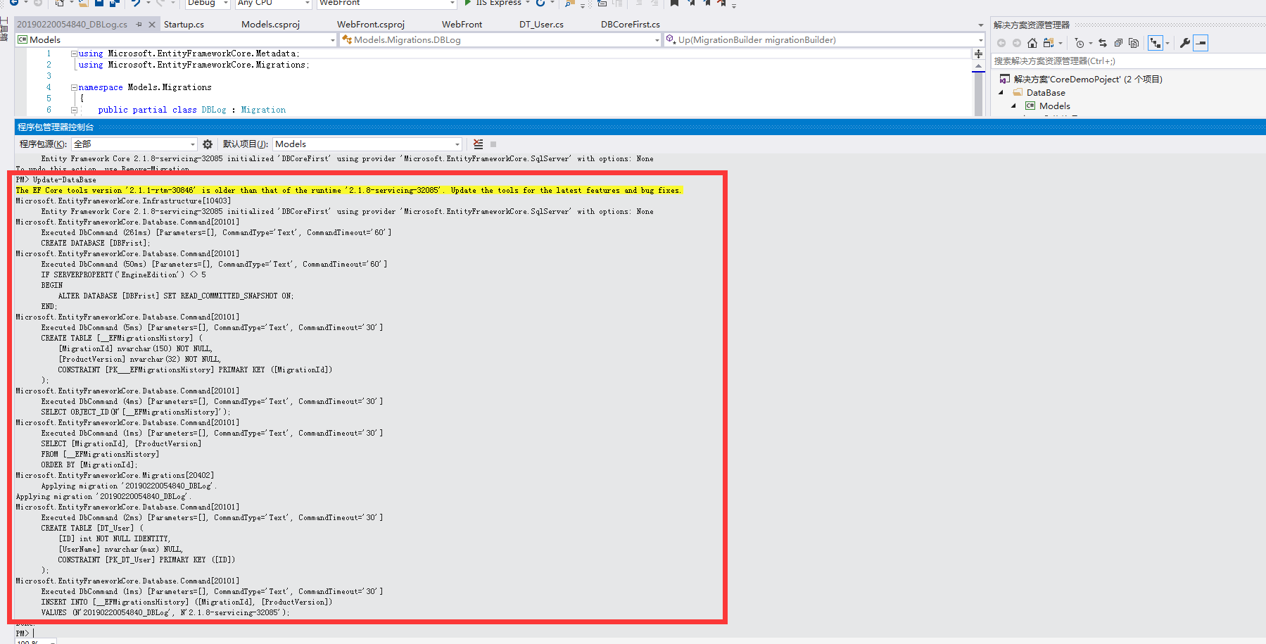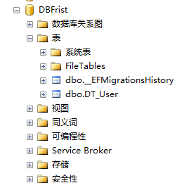 然后我们在执行命令:“Update-DataBase”,成功后我们查看数据库会自动生成数据库“DBFrist”和我们新增的实体表DT_User表