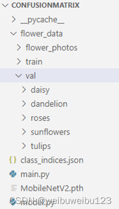使用MobileNet_V2深度神经网络,进行测试,其中目录的权重文件MobileNetV2.pth是进行5次的训练得到,训练的数据集合为flower_data,共包含5个类别:“daisy、dandelion、roses、sunflowers、tulips”,目录中的modle.py文件为MobileNet_V2网络。目录结构如下图所示: