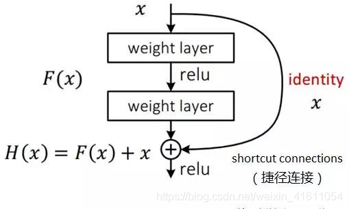在上图的残差网络结构图中,通过“shortcut connections(捷径连接)”的方式,直接把输入x传到输出作为初始结果,输出结果为H(x)=F(x)+x,当F(x)=0时,那么H(x)=x,也就是上面所提到的恒等映射。于是,ResNet相当于将学习目标改变了,不再是学习一个完整的输出,而是目标值H(X)和x的差值,也就是所谓的残差F(x) := H(x)-x,因此,后面的训练目标就是要将残差结果逼近于0,使到随着网络加深,准确率不下降。这种残差跳跃式的结构,打破了传统的神经网络n-1层的输出只能给n层作为输入的惯例,使某一层的输出可以直接跨过几层作为后面某一层的输入,其意义在于为叠加多层网络而使得整个学习模型的错误率不降反升的难题提供了新的方向。至此,神经网络的层数可以超越之前的约束,达到几十层、上百层甚至千层,为高级语义特征提取和分类提供了可行性。