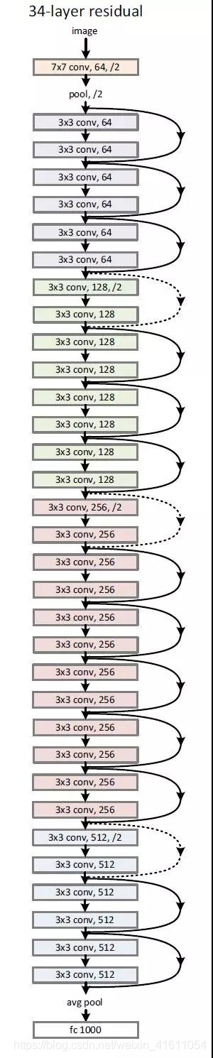 虚线的的Connection部分,表示通道不同,如上图的第一个绿色矩形和第三个绿色矩形,分别是3x3x64和3x3x128的特征图,通道不同,采用的计算方式为H(x)=F(x)+Wx,其中W是卷积操作,用来调整x维度的。