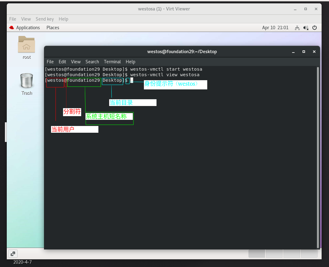 [root(运行shell的用户@(分割符)foundation29(系统主机短名称) Desktop(当前目录)]# (身份提示符root)