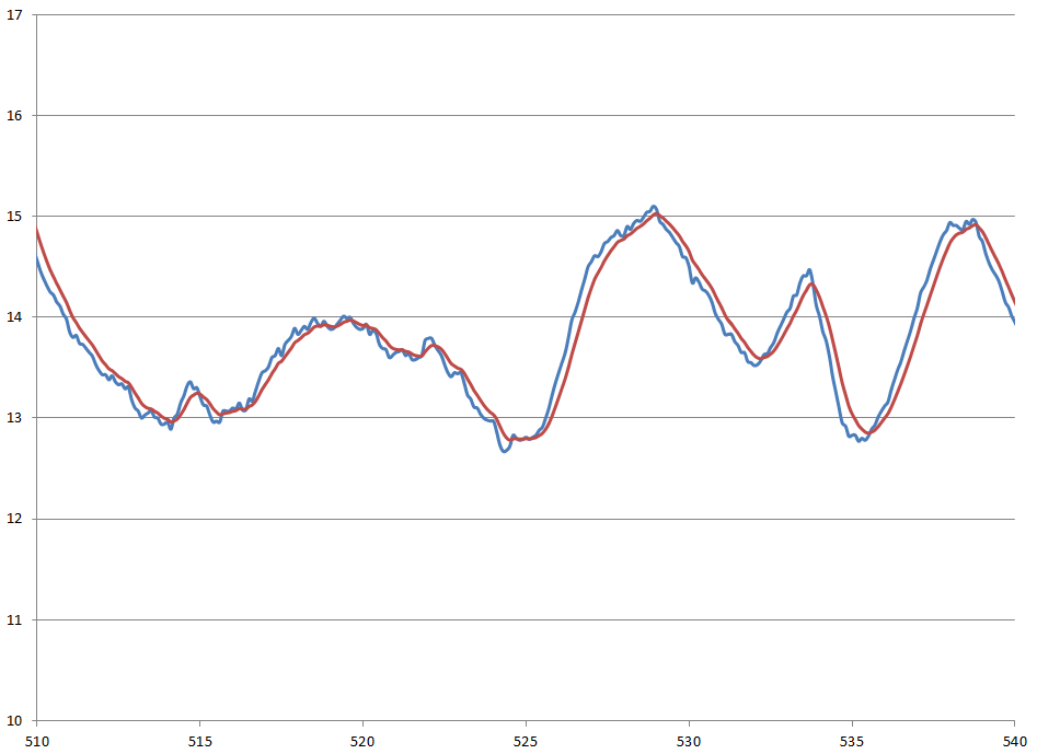 下面我们通过是一个车速滤波的示例来体验卡尔曼滤波的效果。通过上面的介绍,R对滤波效果的影响比较大,在这个示例中,我们分别将R取为0.1和0.5,来看一下车速的滤波效果。首先R取为0.1时,滤波效果如下图所示。其中,蓝色线为滤波前的车速,红色线为滤波后的车速。从图中可以看到滤波后的信号与滤波前的信号跟随很好,滞后很小。基本波动被滤掉了,但也带入了一些波动。