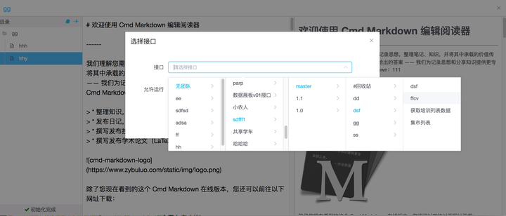 因为DOClever一直在做接口管理的功能,所以对于接口的支持是非常强大的,它可以实现接口和文档的无缝连接,我们在刚才的右键菜单选择插入接口,我们便可以选择不同的团队,不同的项目,不同的版本的接口了: