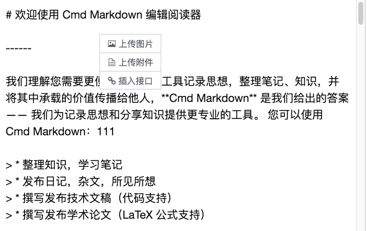 编辑区域采用的是markdown语法编写,因为用的是websocket,所以彻底告别手动保存,实时修改实时保存,同时支持实时滚动预览,我们在内容编辑区点击右键,弹出操作菜单: