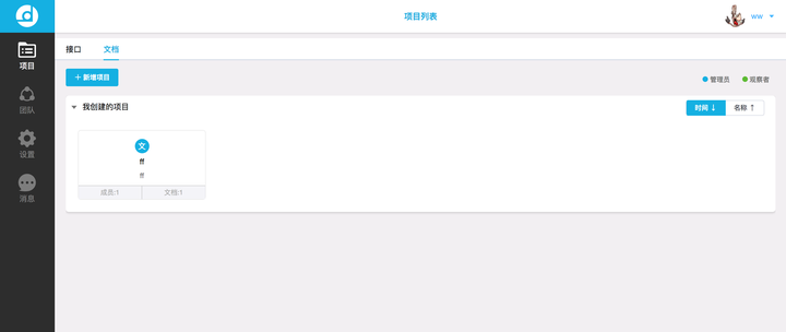 首先我们可以在线上环境先体验下,如果觉得不错,可以部署线下的环境(GitHub:sx1989827/DOClever),我们打开DOClever的官网:http://doclever.cn 注意一个新账号,然后登陆到控制台,在项目中选择切换到文档标签页,新建一个项目: