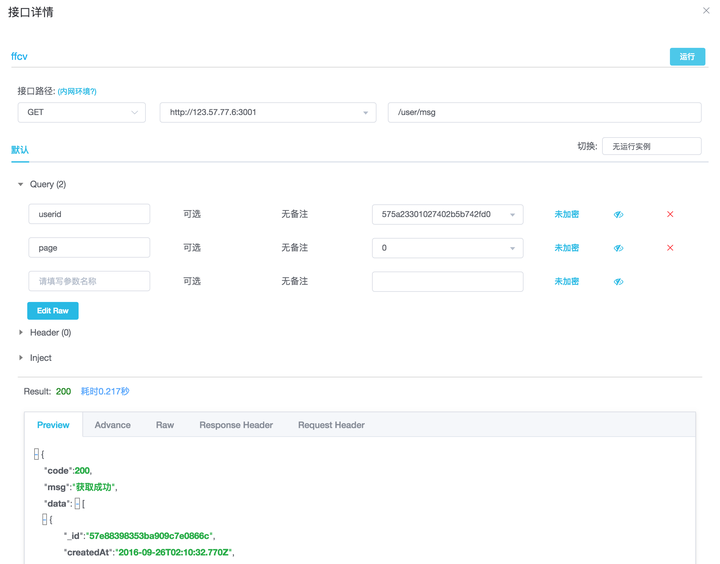我们点击弹出框最下面的运行按钮,便可以测试该接口的数据了。