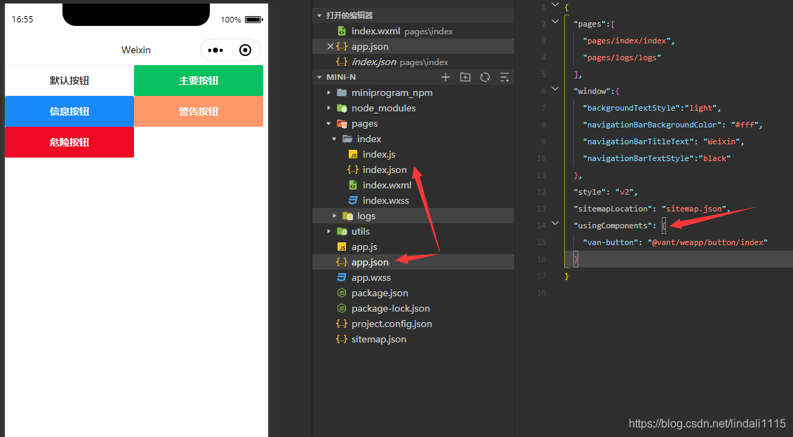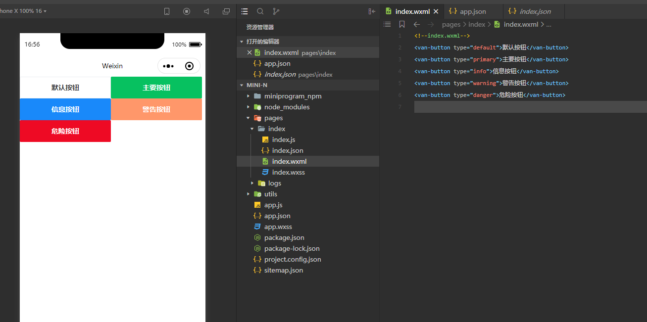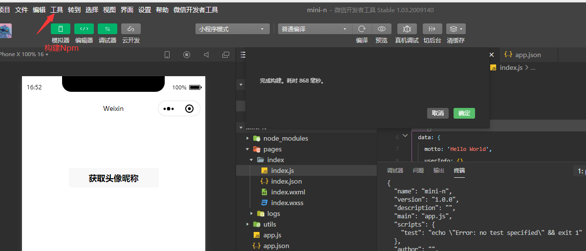 4.在微信开发者工具中的菜单栏:工具 --> 构建 npm