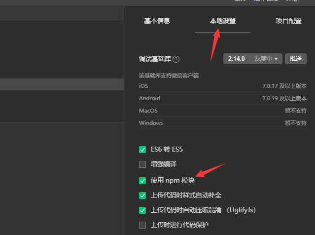 4.在微信开发者工具中的菜单栏:工具 --> 项目详情, 勾选“使用 npm 模块”选项: