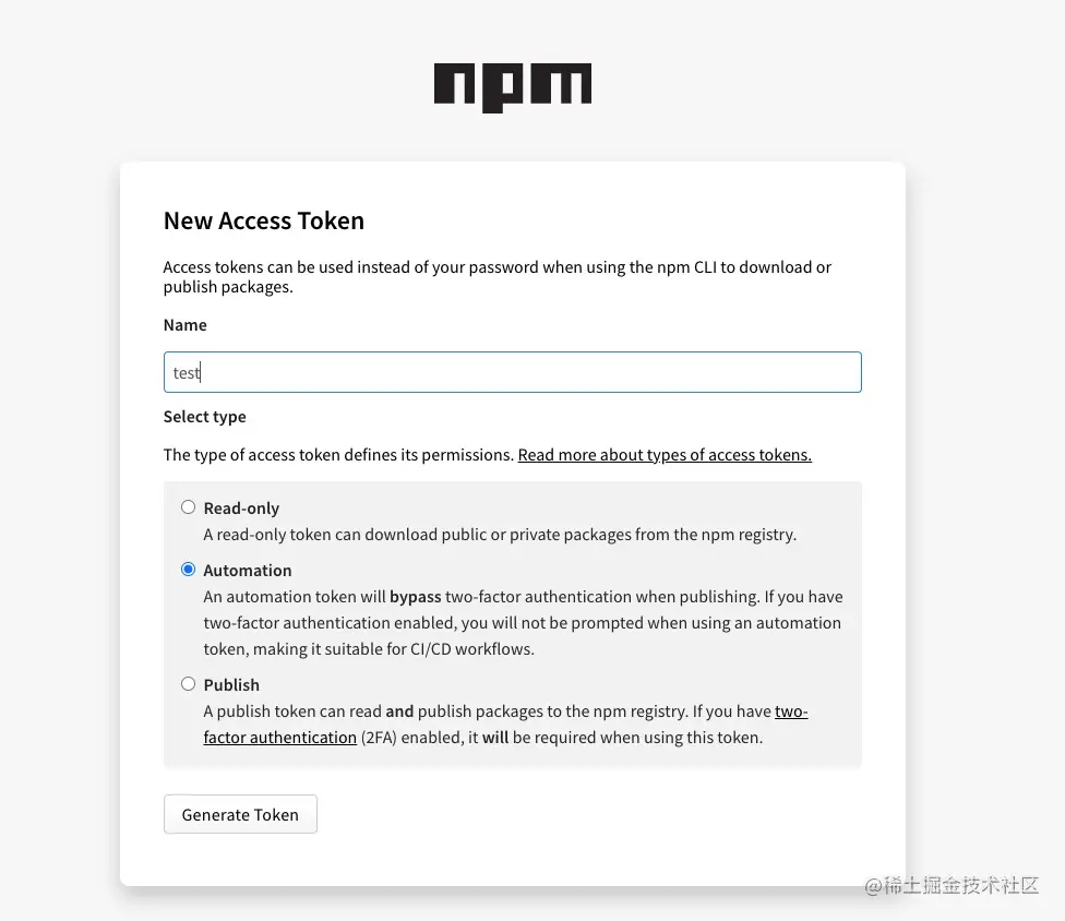 4.接下来,在npm官网右上角点击自己的用户头像,选择Access Tokens,再点击Generate New Token按钮生成token(需要再次输入密码)。 然后创建Automation类型的token,token名称随意写,点击生成token。界面会返回一个token给你,记得手动保存一下token(因为离开界面后就再也看不到完整的token,需要重新生成)
