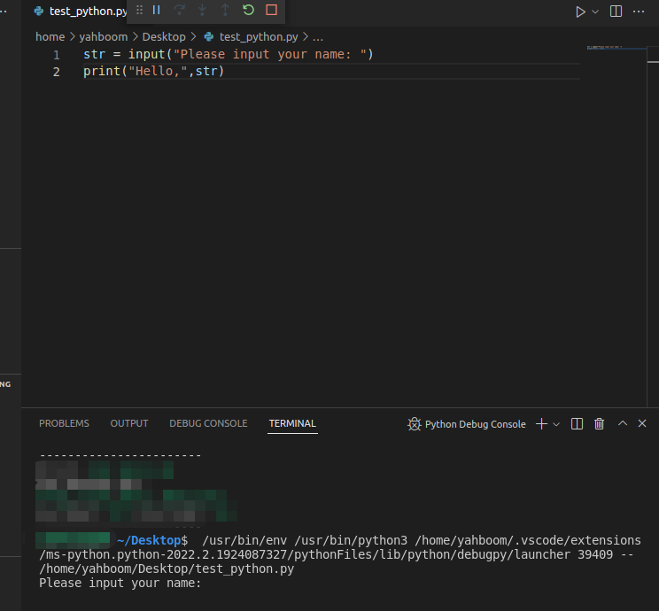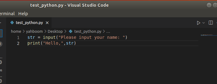 print("Hello,",str)输入后,保存,如下图所示,VS Code会根据文件后缀识别出这是python文件,