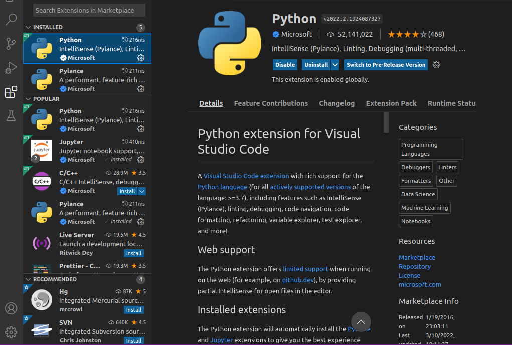 (2)、第一个就是python,C++和ROS在搜索框里边搜索,然后点击安装,以python为例子,