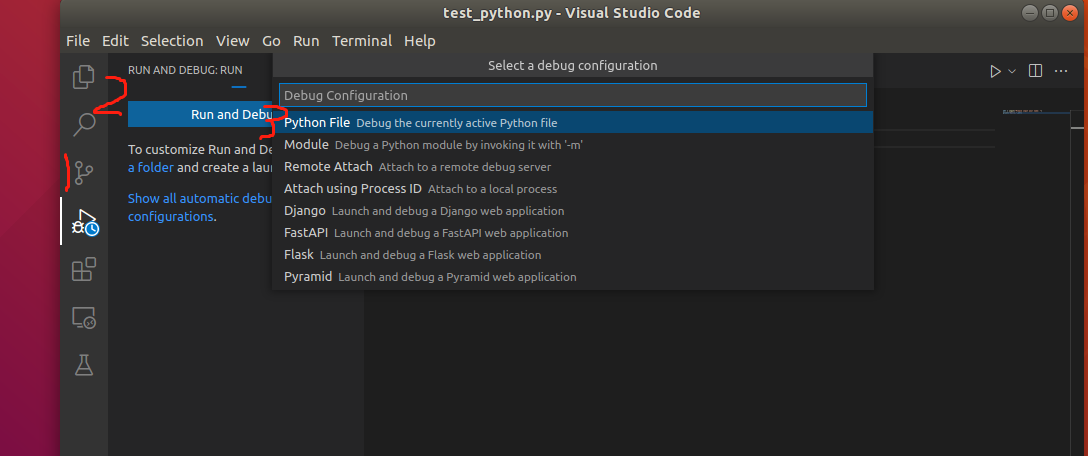 (3)、点击左边的Run and Debug->Run and Debug->Python Flie,如下图所示,