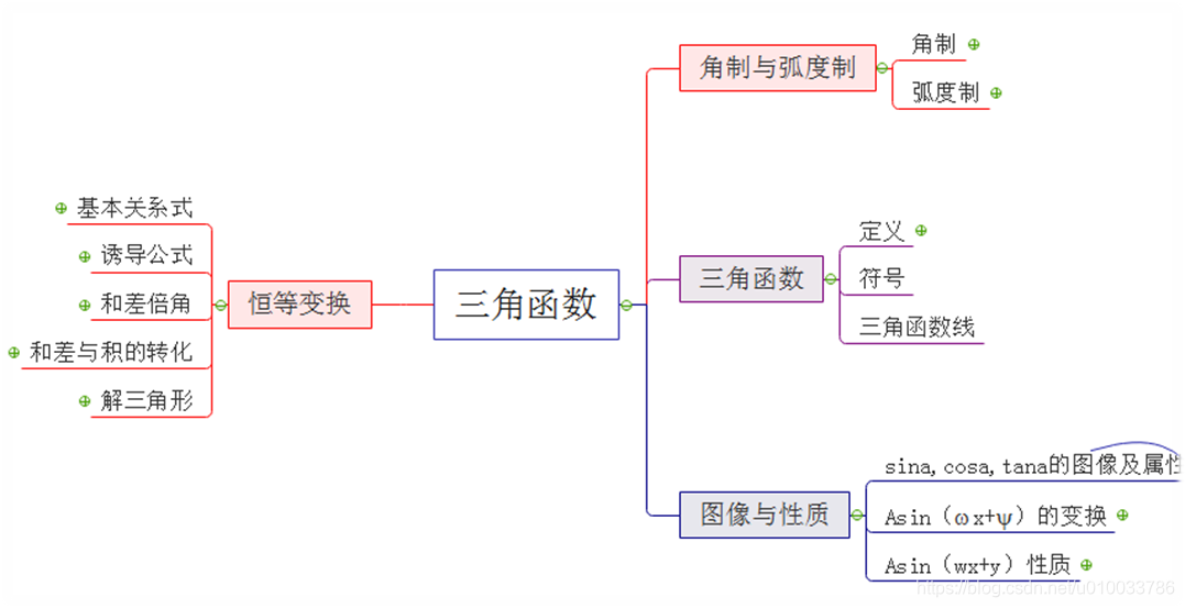 上节,我们介绍了三角函数的角制与弧度制,还有基本属性。下面我们介绍三角函数的恒等变换中的基本关系式和诱导公式。图一,还是我们学习三角函数的思维导图。