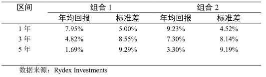 其中,组合 1 为普通积极管理组合,由 60%股票、30%债券和 10%现金构成;组合2 为 Alpha 策略例子,由 40%的杠杆为 1.5 的股票(期货)、30%债券、10%商品和 10%绝对收益品种,后两者为 Alpha 的来源。股票为 S&P 500 指数(指数期货),商品为高盛商品指数,绝对回报为 S&P 对冲基金指数。可以发现,可转移 Alpha 策略有较高的收益和较低的风险。