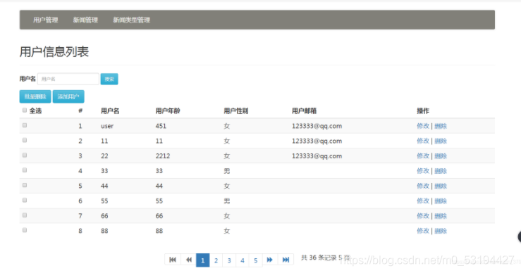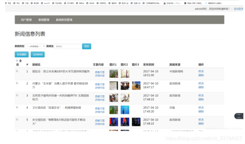 后台部分为用户管理,评论管理、新闻管理、新闻类型管理、收藏管理。分别有增加、删除、修改、查找等权限。