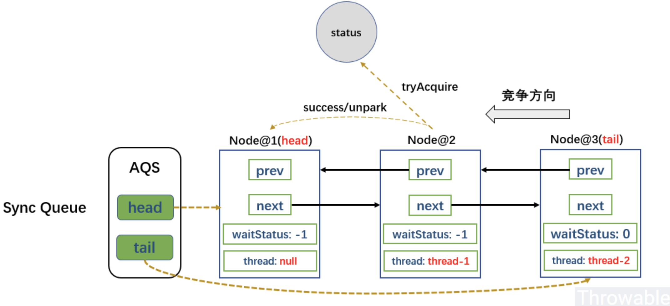 当线程离开同步块时,会修改 state 的值,将其设为 0,并唤醒等待的线程。所以在 AQS 同步中,我们说线程获得了锁,实际上是指线程成功修改了状态变量 state,而线程释放了锁,是指线程将状态变量置为了可修改的状态(在独占式同步中就是置为了 0),让其他线程可以再次尝试修改状态变量。在下面的表述中,我们说线程获得和释放了锁,就是上述含义, 这与 synchronized 同步中说的获得和释放锁的含义不同,需要区别理解。