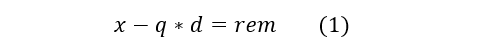 将被除数x,商q,除数d,余数rem关系表示如下: