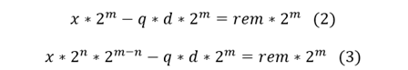 x和d分别进行归一化操作,即x左移n位,d左移m位。一般地,当n>m时表示x<d,此时商q为0,余数rem为x;n<=m时,才需要使用算法求解。