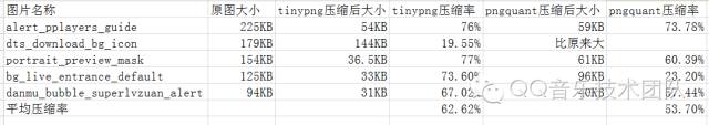选取QQ音乐Android项目中占用空间最大的几个PNG图片进行压缩效果的对比,通过pngquant.exe脚本以及tinypng网站分别进行单个压缩,压缩率如下图所示:(pngquant使用默认压缩品质)