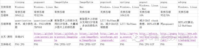 根据资料显示,tinypng、pngquant、ImageAlpha、pngnq都是有损压缩,基本采用的都是quantization算法,将24位的PNG图片转换为8位的PNG图片,减少图片的颜色数;pngcrush、optipng、pngout、advpng都是无损压缩,采用的都是基于LZ/Huffman的DEFLATE算法,减少图片IDAT chunk区域的数据。一般有损压缩的压缩率会大大高于无损压缩。