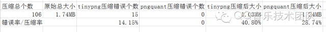 选取项目中大小4KB以上的106个PNG图片进行压缩实现,效果对比如下:(pngquant使用默认压缩品质)